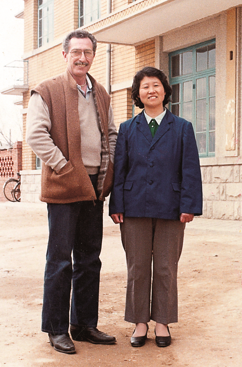 1981年,李桂莲厂长与美国派斯拉姆公司迪工程师(第一个到杨树房的美国客商)在杨树房办公楼前合影。
